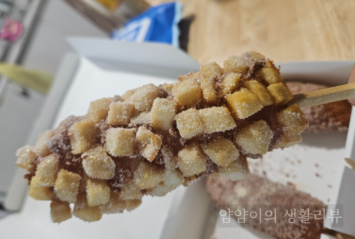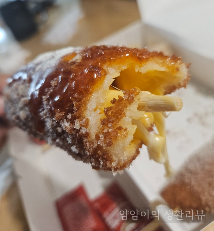 명랑핫도그 특유의 쫄깃한 반죽과 고소한 맛이 배달로도 그대로 살아있어서 놀랐어요. 요거 배달로 먹으면 좀 눅눅해지면 어쩌나 고민이 되기도 했어요. 매장에서 바로 사먹었을때는 바삭한데 박스에 배달이 오면 습기가 머금어서 눅눅해질 수 있잖아요.
